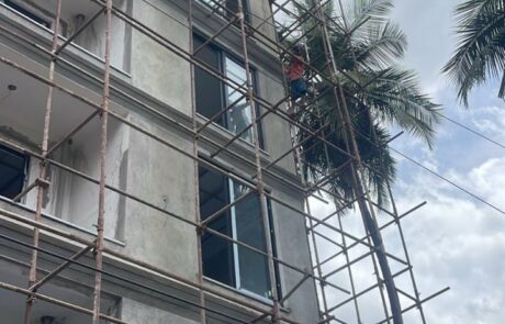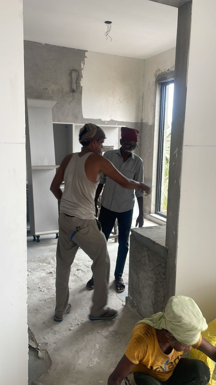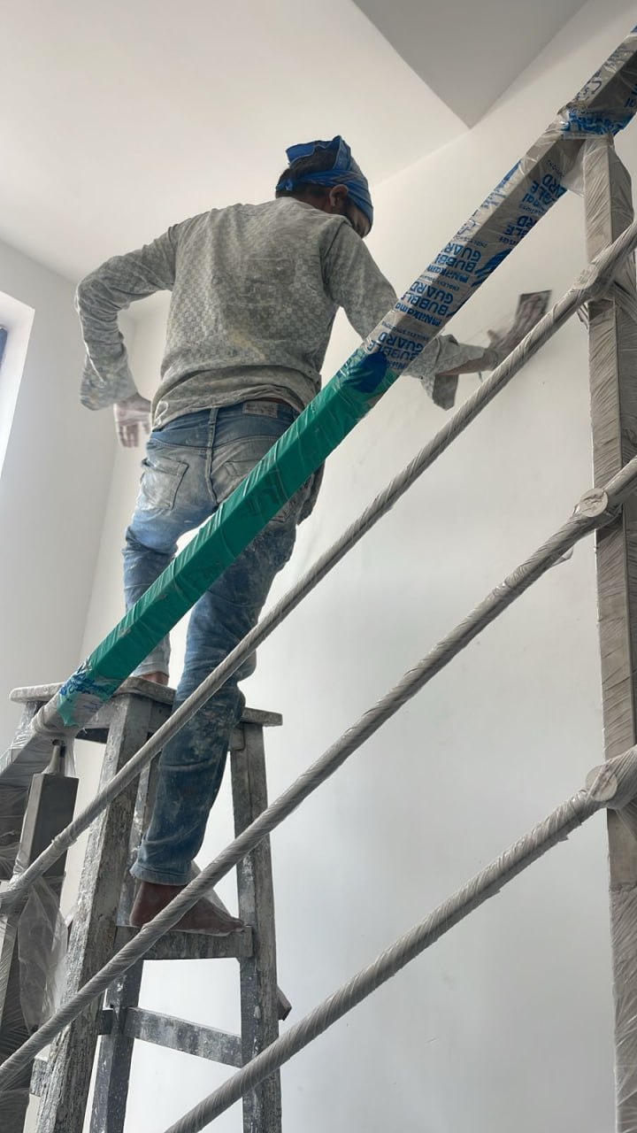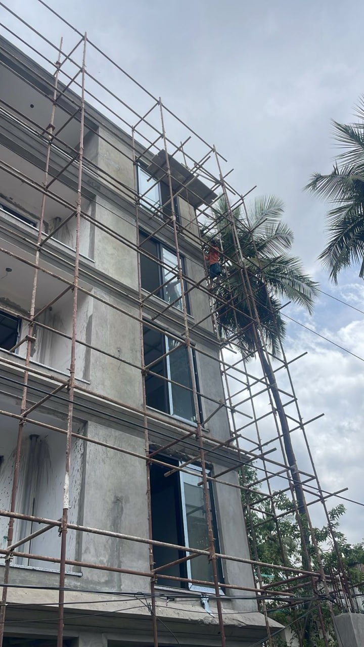Front elevation triangle beam touch up plastering work in progress